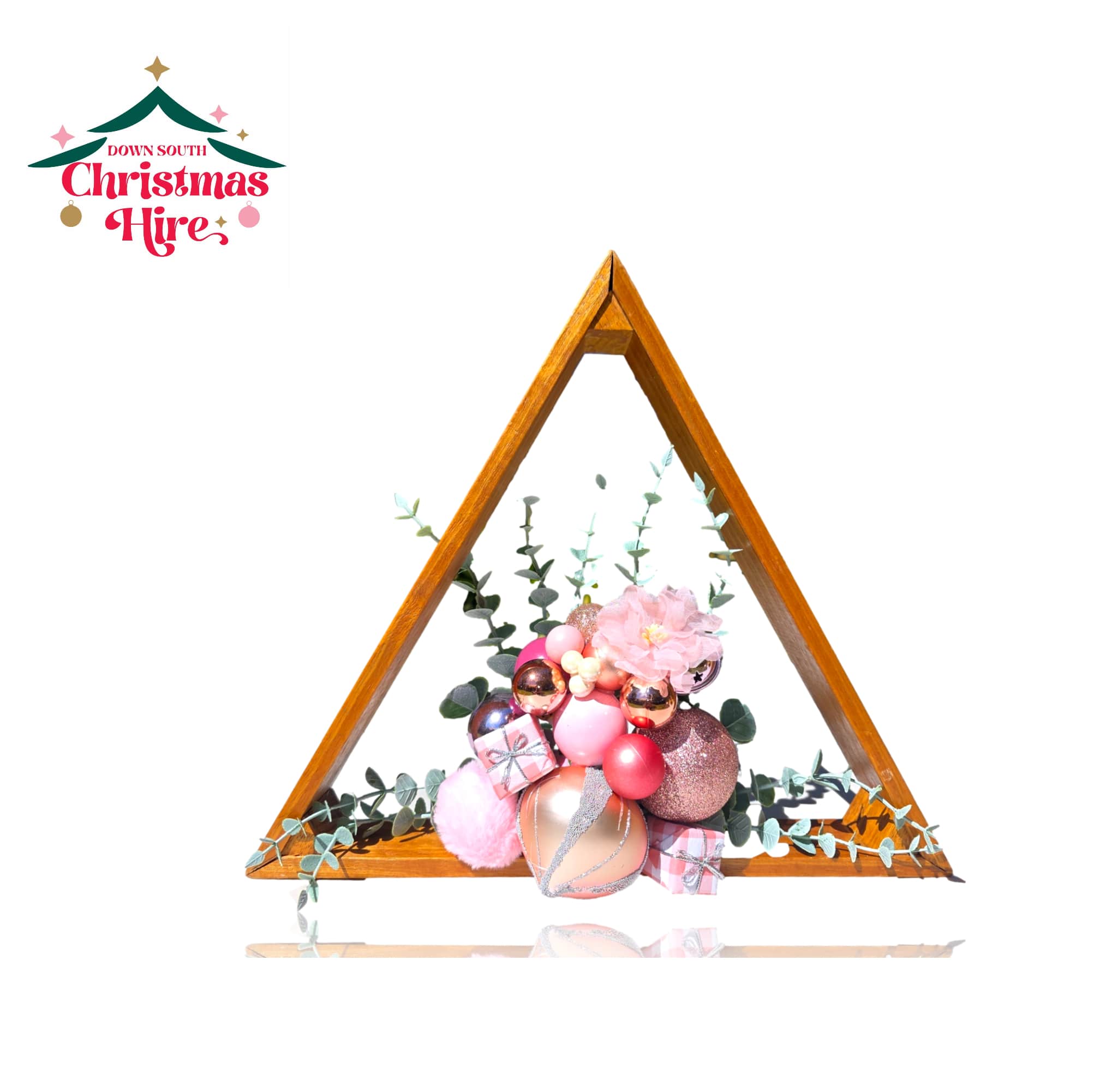 This unique decoration features a minimalist natural timber pyramid frame filled with a lavish, curated cluster of ornaments. The arrangement showcases a stylish pink and gold palette, including glossy, glittered, and mirrored baubles, small plush pink pom-poms, miniature wrapped gifts, and a delicate pink silk flower. Soft eucalyptus-style greenery adds a lovely, refreshing backdrop.