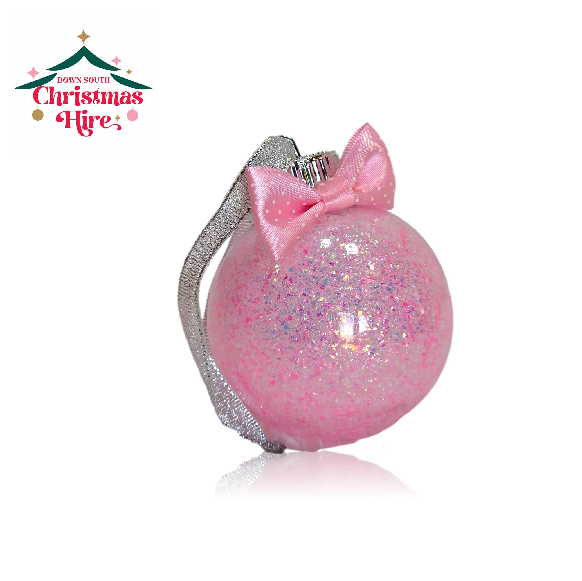 This stunning ornament features a clear ball filled with iridescent pink glitter, giving it a magical, snow-globe effect that shimmers beautifully under the lights. It’s elegantly finished with a sweet blush pink polka-dot bow and a glittering silver hanging ribbon.