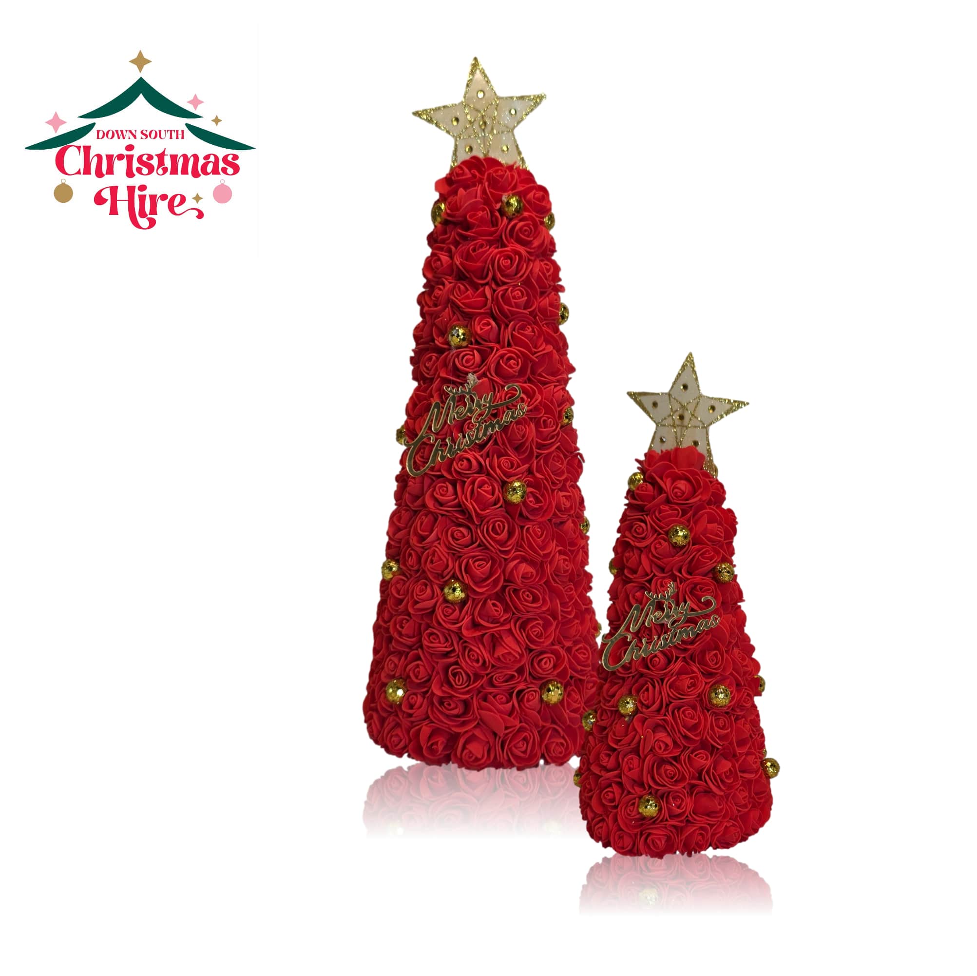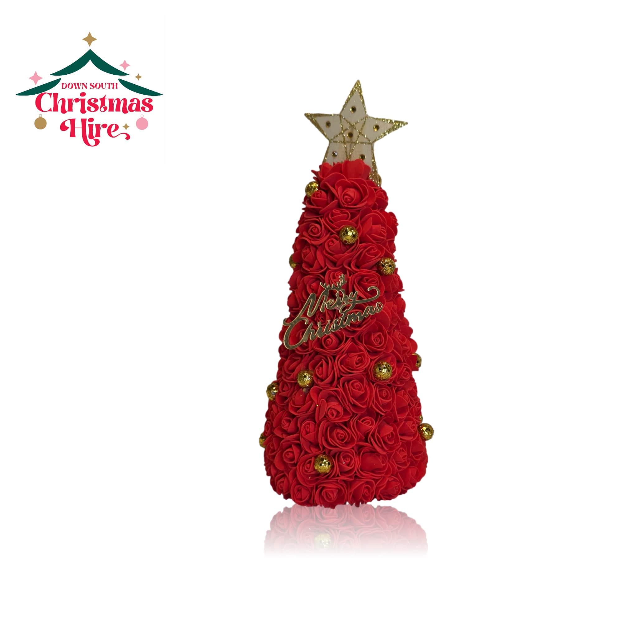 This striking piece is entirely covered in layers of rich, vibrant red foam roses, creating a lush, luxurious, and intensely festive texture. It’s elegantly detailed with small gold baubles nestled among the roses and features a sparkling gold “Merry Christmas” script on the front. The tree is crowned with a beautiful beaded and glittered star topper.