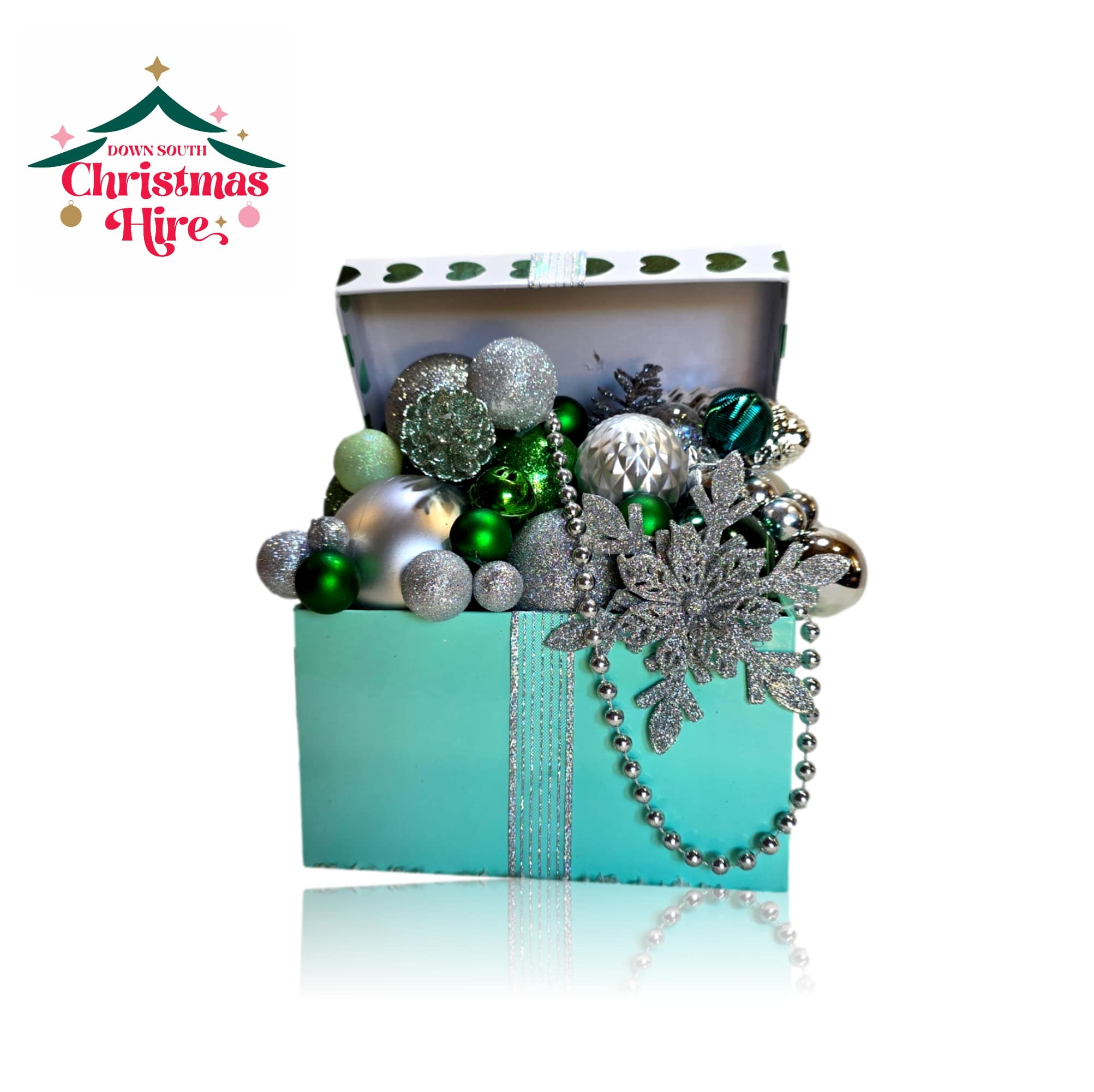 This unique decoration features a chic mint green gift box tied with a glittering silver ribbon. The box is dramatically overflowing with a dazzling, curated arrangement of holiday accents in shimmering tones of lime green, emerald, and silver. The display includes: