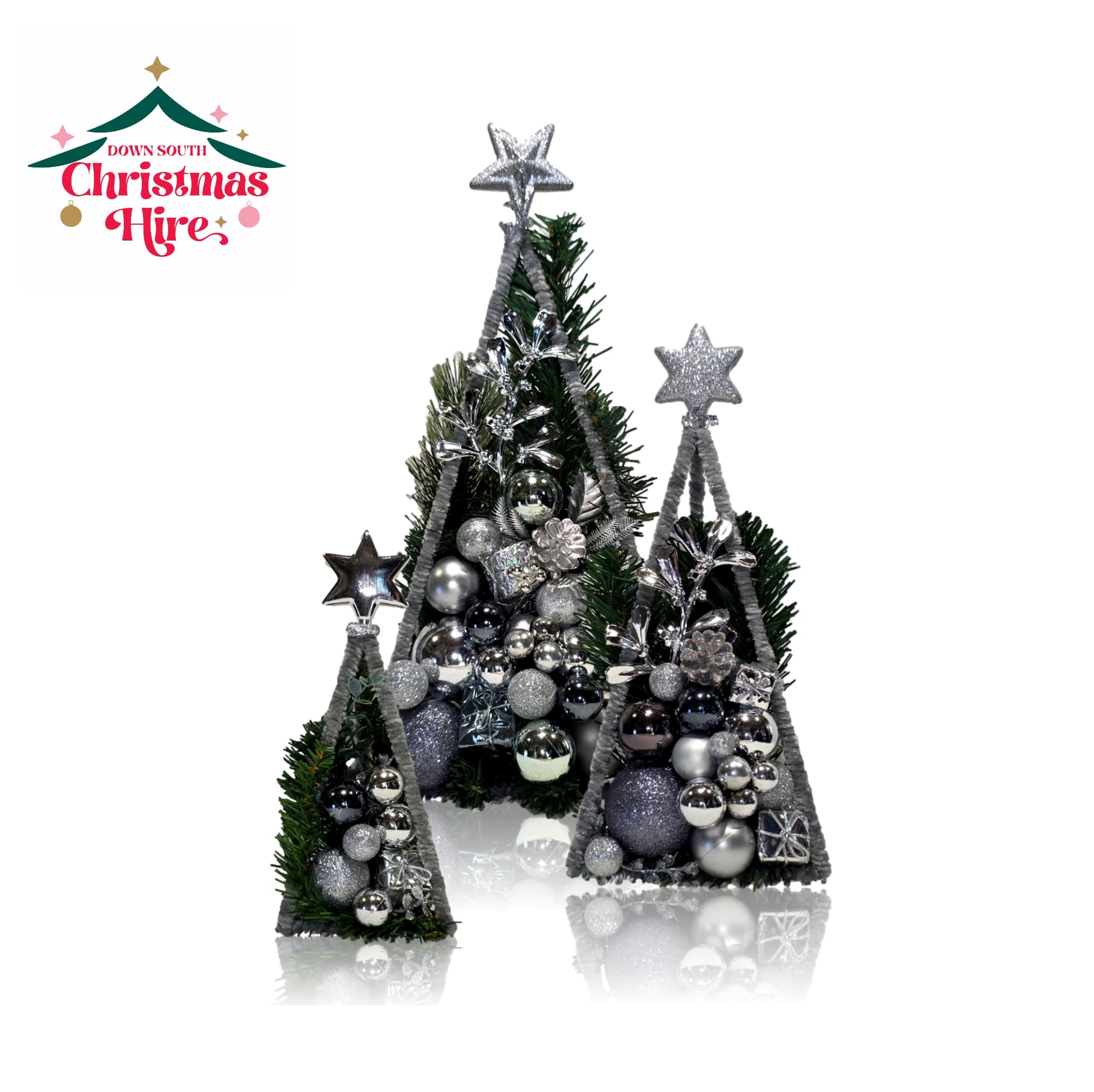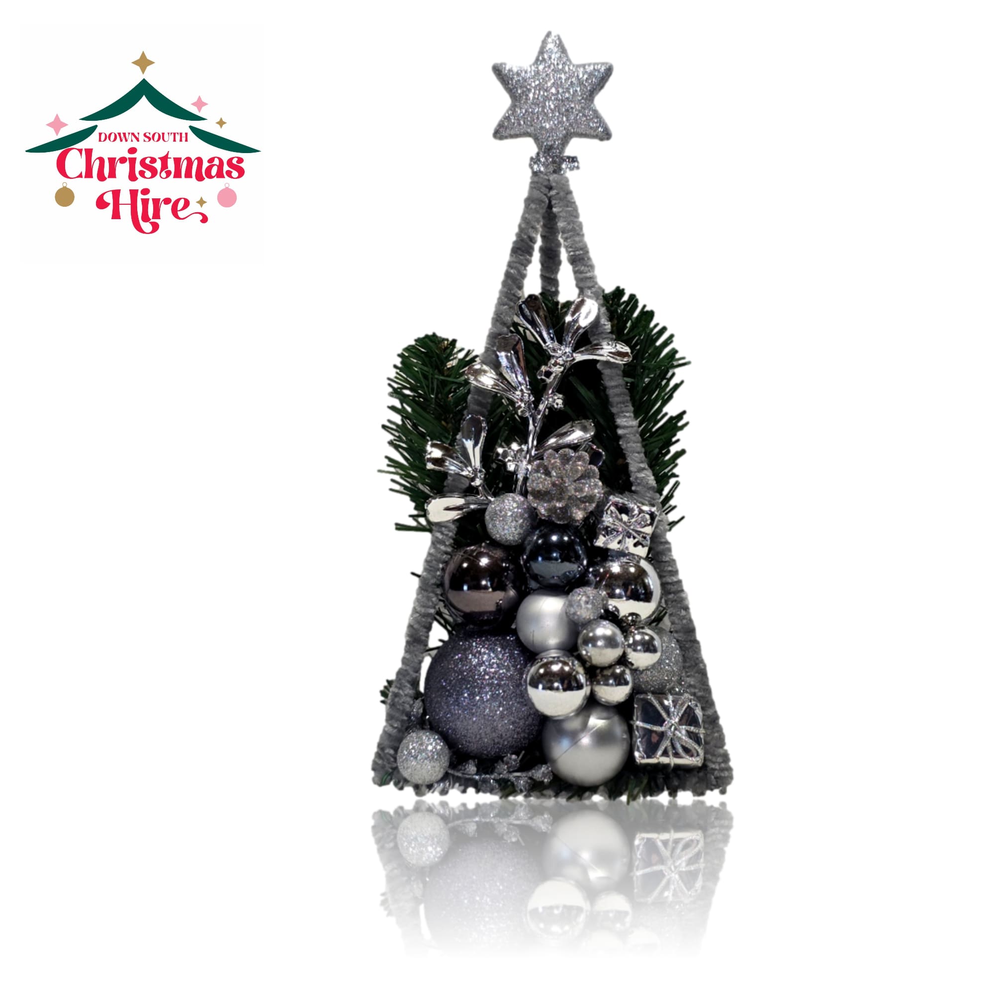 This unique piece features a stylish pyramid frame wrapped in a festive green medium. The open-frame design is elegantly filled with a dense, glittering assortment of silver, charcoal, and icy white baubles in a variety of textures and sizes for a dynamic, opulent display. The tree is finished with a shimmering silver star topper.