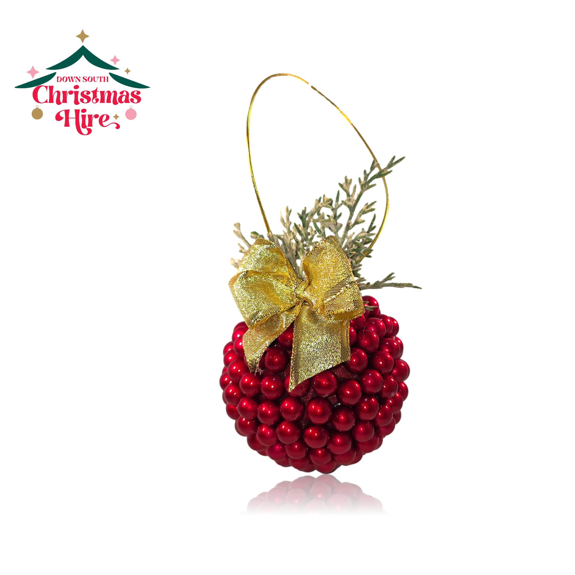 This exquisite ornament features a sphere covered entirely in glossy burgundy beads, creating a striking, dimensional texture. It’s elegantly topped with a festive arrangement: a sprig of natural-look foliage, and a classic gold mesh bow hanging from a gold cord.
