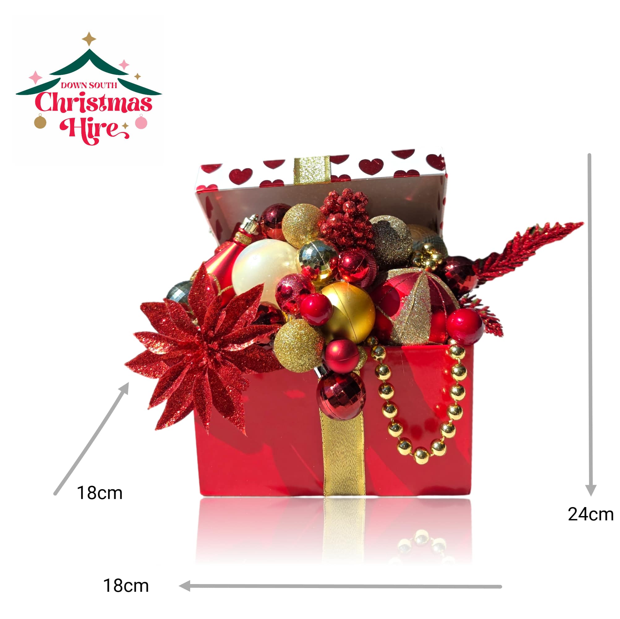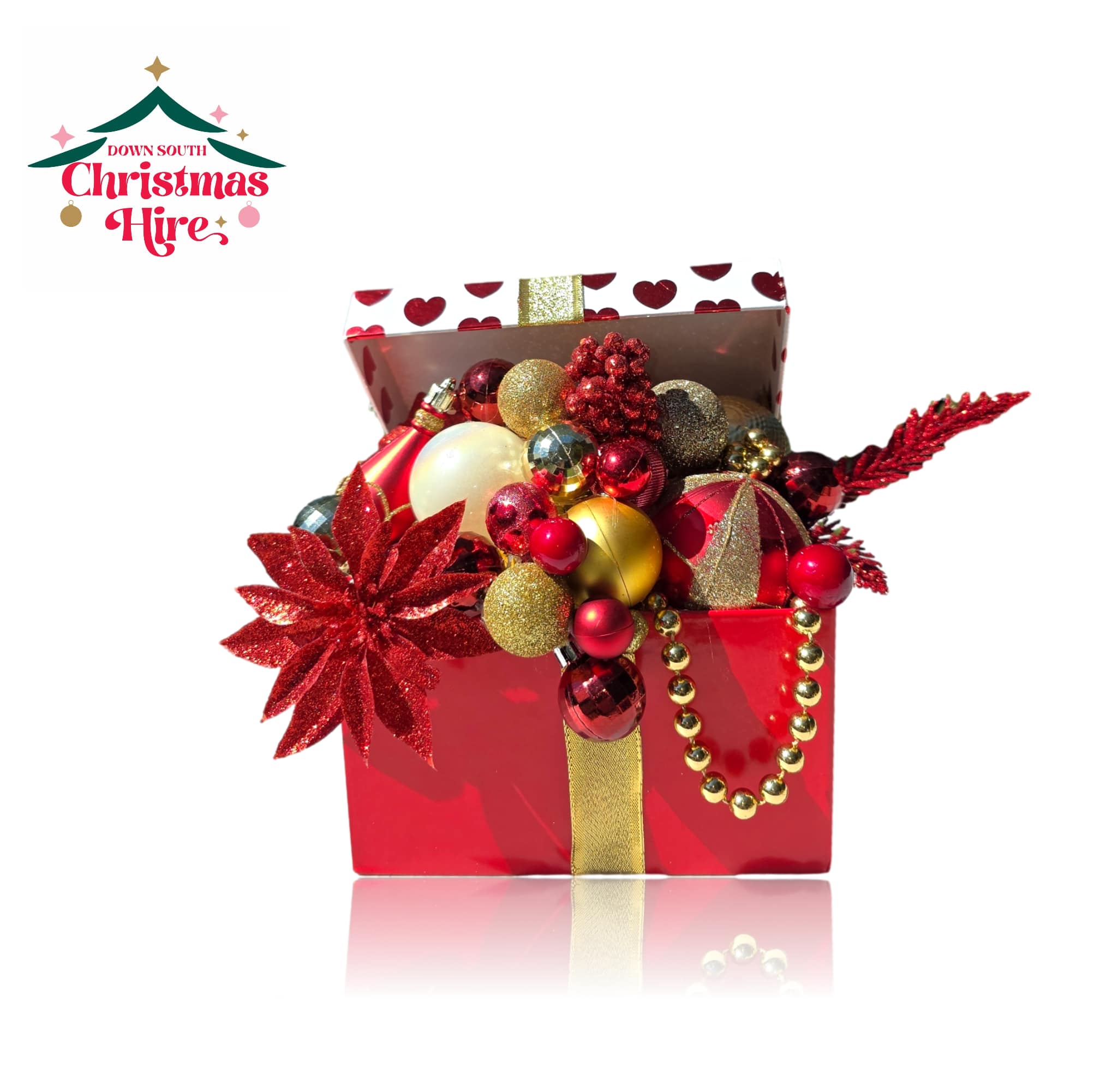 This unique decoration features a vibrant glossy red gift box tied with a sparkling gold ribbon. The box is overflowing with a decadent and dramatic arrangement of holiday accents in rich tones of red, gold, and deep burgundy. The display includes: