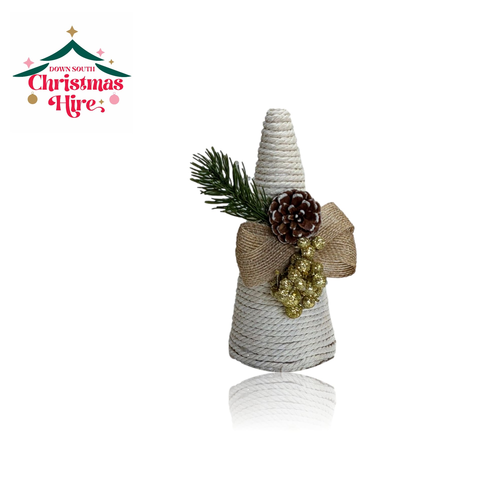 It’s beautifully adorned with natural elements including a real pinecone and a fresh pine sprig, complemented by a rustic burlap ribbon. A shimmering cluster of gold glittered baubles adds a touch of festive sparkle and elegance.