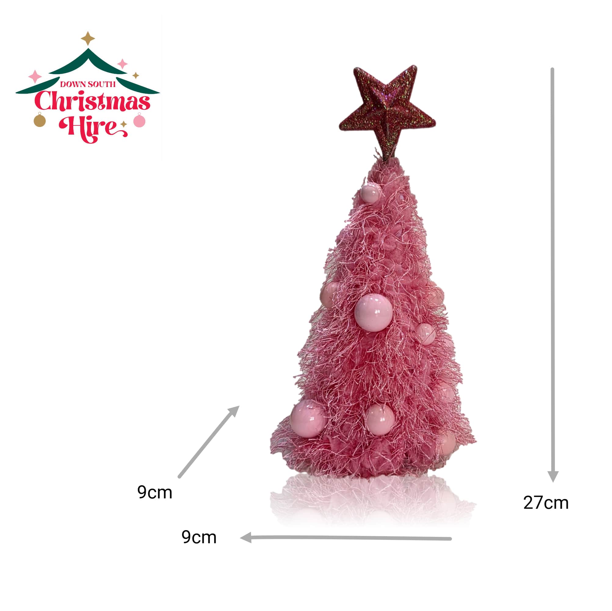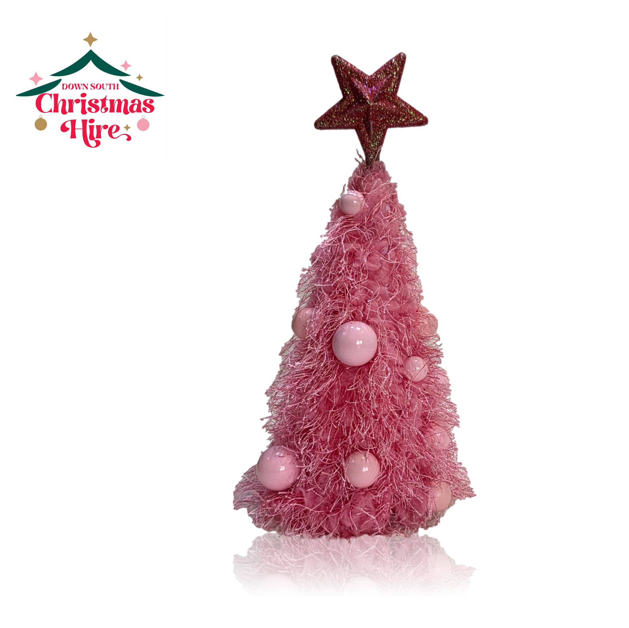 This charming tabletop tree is covered in soft, shaggy pink fringe that gives it an irresistible, playful texture. It’s adorned with coordinating glossy pink baubles scattered across the surface for a sweet, monochromatic look. The tree is crowned with a dazzling, dark pink glitter star topper.