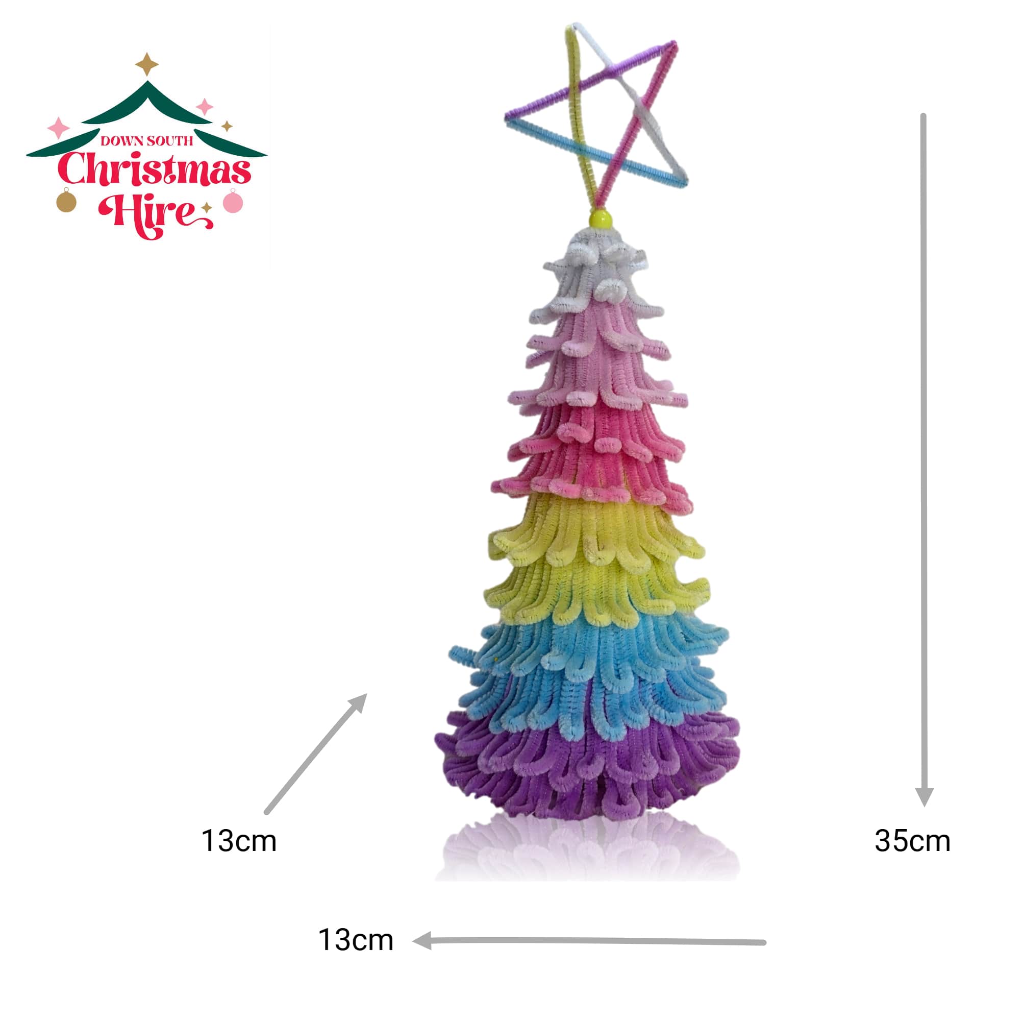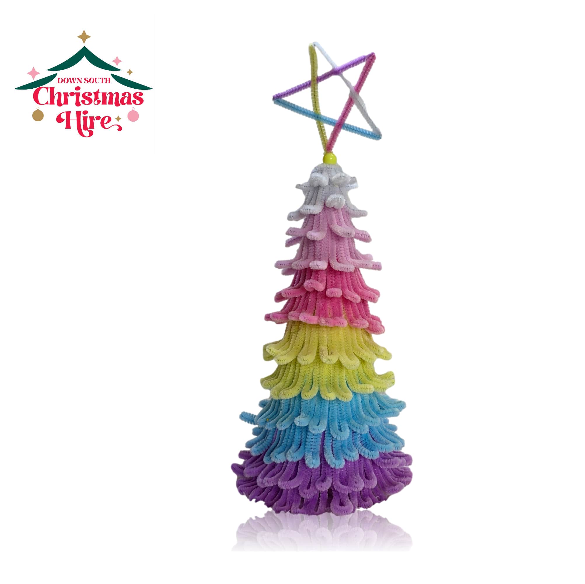 This playful, vibrant piece is crafted from layered, fluffy pipe cleaners in a cascade of bright colours, including purple, blue, yellow, dark pink, light pink and white. The tiered design gives it a wonderful, soft texture, reminiscent of classic craft projects. It’s finished with a striking multicoloured pipe cleaner star on top.